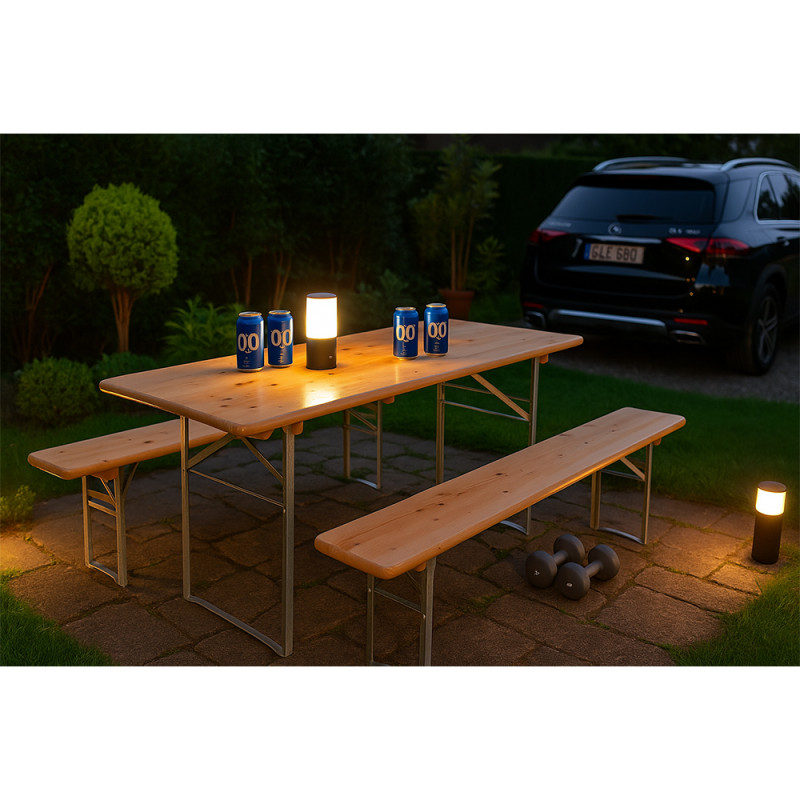 Идеален за градини, викендички, угостителски објекти, фестивали или приватни настани. Овој пивски сет нуди стабилност, издржливост и природна естетика. Конструкцијата е дизајнирана за лесно склопување и складирање, што го прави практичен избор за секоја пригода.